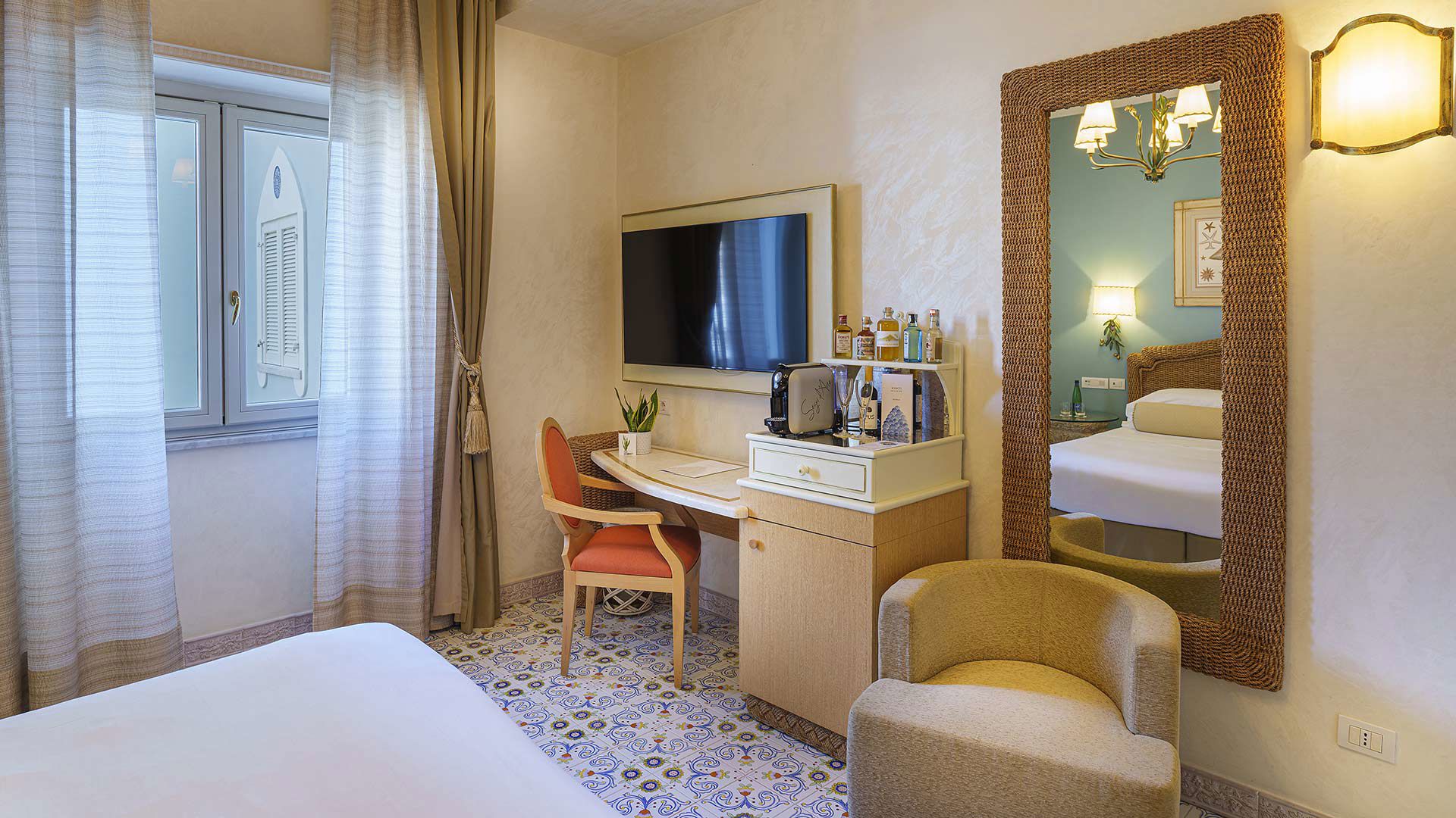 Relax in the tranquil atmosphere of this room category (26 m²-280 sqft), overlooking the serene and peaceful garden patio. Tasteful furnishings, comforts and refined details make this category the perfect choice for a modest and cozy stay