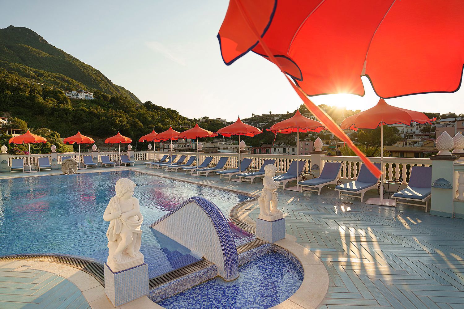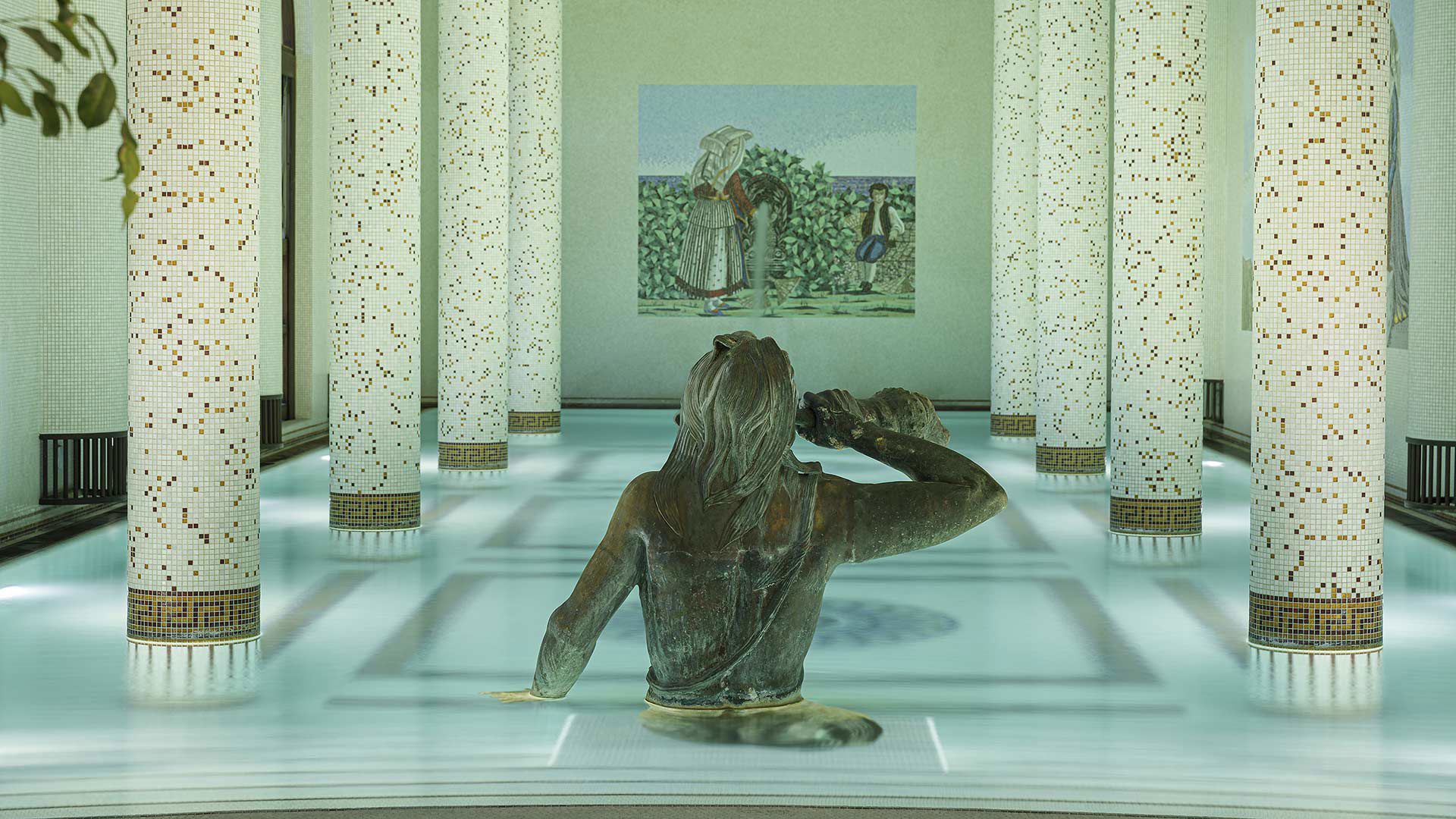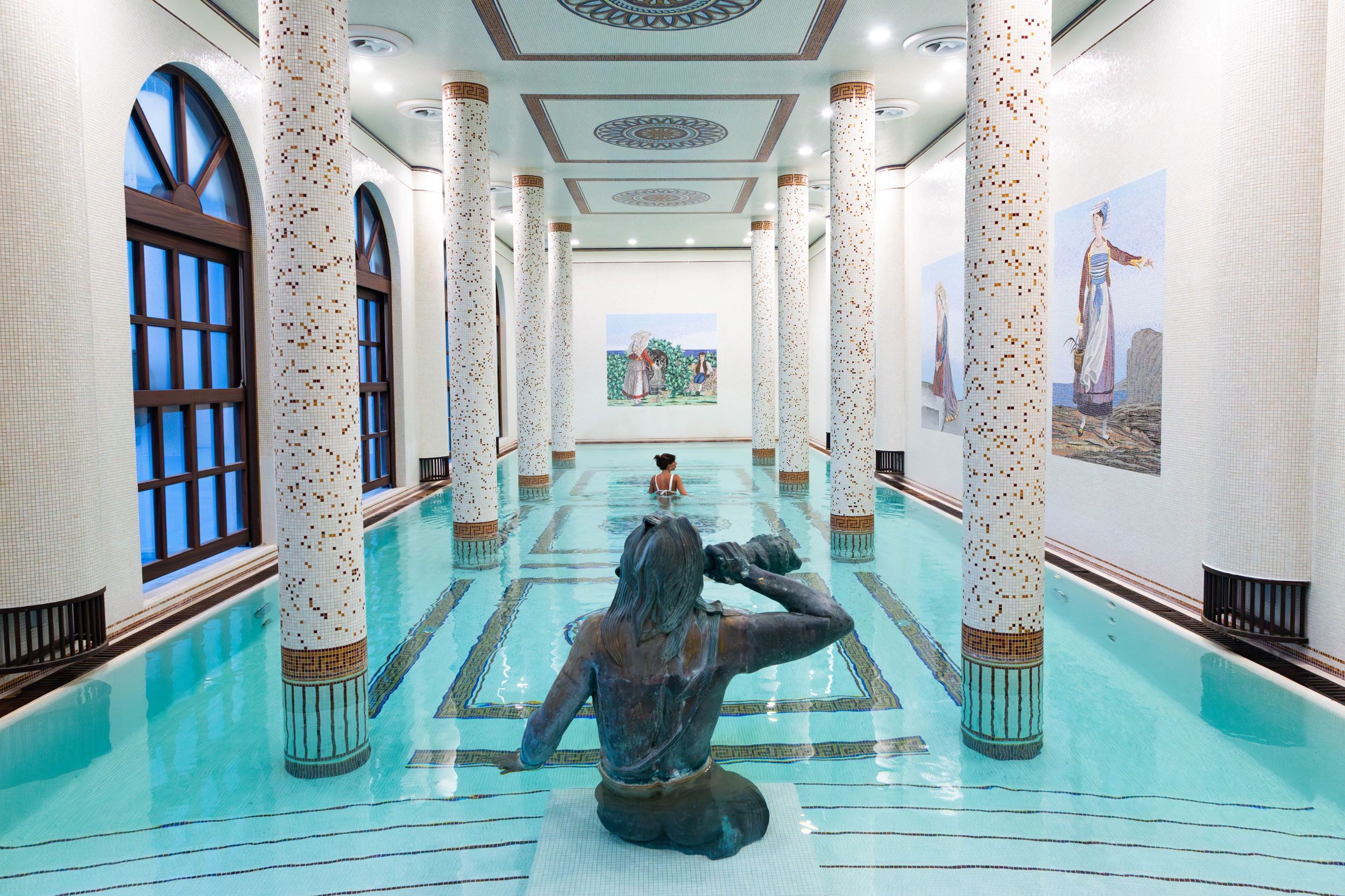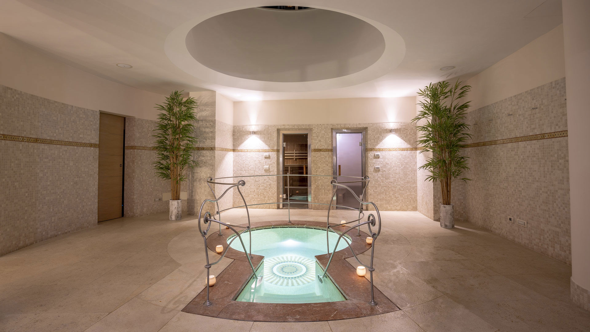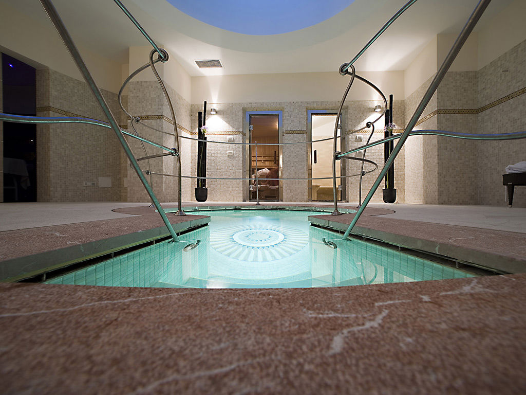 La seconda ampia piscina è situata all’interno, adiacente alla zona Spa. E’ caratterizzata da acqua calda termale in un ambiente incorniciato da caratteristici mosaici decorativi e zona relax con vista sul giardino dell’ elegante corte interna della dimora.